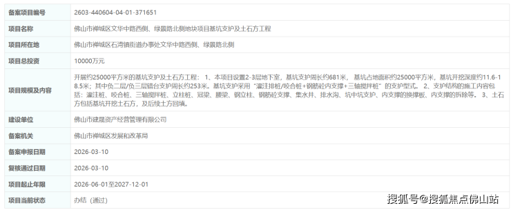 近日,佛山市禅城区文华中路西侧、绿景路北侧地块项目基坑支护及土石方工程正式备案。