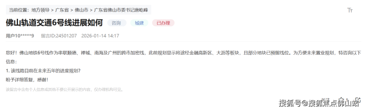 近日,有网友在领导留言板上咨询佛山轨道交通6号线进展如何?