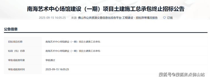 9月15日,佛山市公共资源交易信息化综合平台发布“南海艺术中心场馆建设(一期)项目土建施工总承包终止招标公告”。