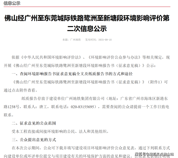 9月18日,广州地铁发布佛山经广州至东莞城际铁路鹭洲至新塘段环境影响评价第二次信息公示。