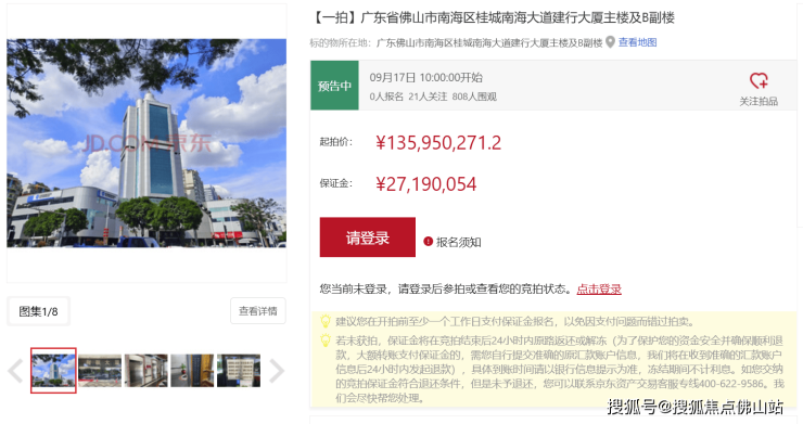 近日,京东司法平台显示,桂城财联大厦将于9月17日开拍,起拍价为1.36亿。