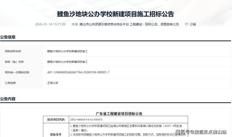近日,佛山市公共资源交易信息化综合平台发布鲤鱼沙地块公办学校新建项目施工招标公告。