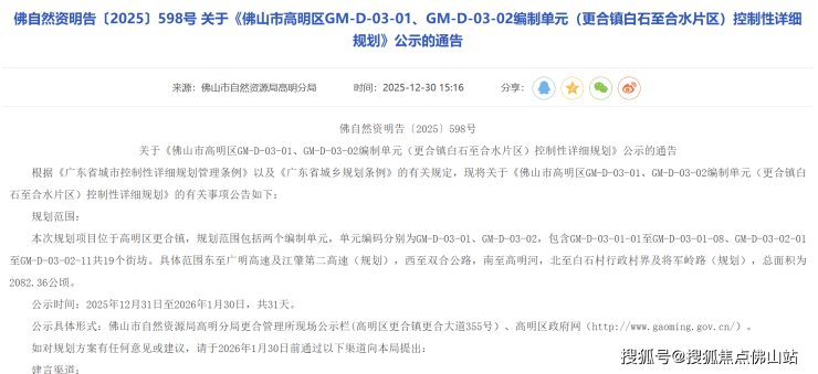 近日,高明区政府网站发布了关于《佛山市高明区GM-D-03-01、GM-D-03-02编制单元(更合镇白石至合水片区)控制性详细规划》公示的通告。
