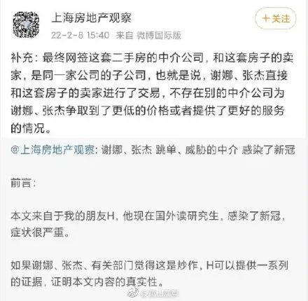 据了解,事情的起因是:一个名叫“上海房产观察”的自媒体账号发文,声称他的朋友“H先生”是豪宅经纪人,曾于2019年6月21日和22日两次为张杰、谢娜带看了位于上海市中心著名豪宅洋房“思南公馆”,后者以不喜欢该房为由不再购买。