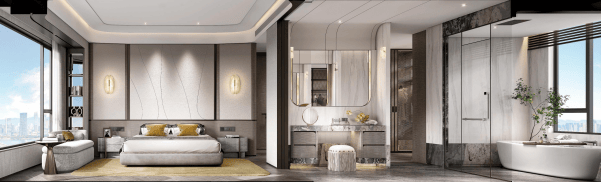 Ø 近40㎡的酒店式主卧套间,约11㎡的步入式衣帽间与约11㎡的双台盆主卫,私密与尊贵兼备。
