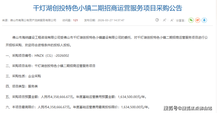公告显示, 佛山市海纳建设工程咨询有限公司受佛山市千灯湖创投特色小镇建设有限公司的委托,对千灯湖创投特色小镇二期招商运营服务项目进行公开招标采购。