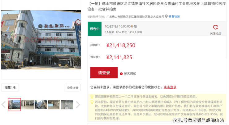 京东法拍平台显示,顺德区龙江镇陈涌社区居民委员会陈涌村工业用地及地上建筑物和医疗设备将于10月21日进行法拍,起拍价2141.825万元。