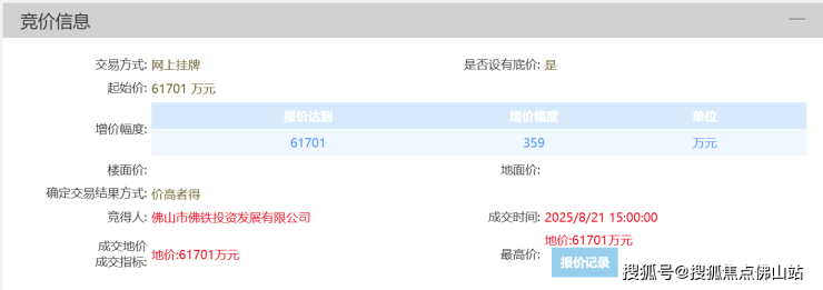 8月21日,佛山市佛铁投资发展有限公司以总价61701万元竞得禅港路北侧、湖一路东侧地块,折合楼面价约6550元/㎡。