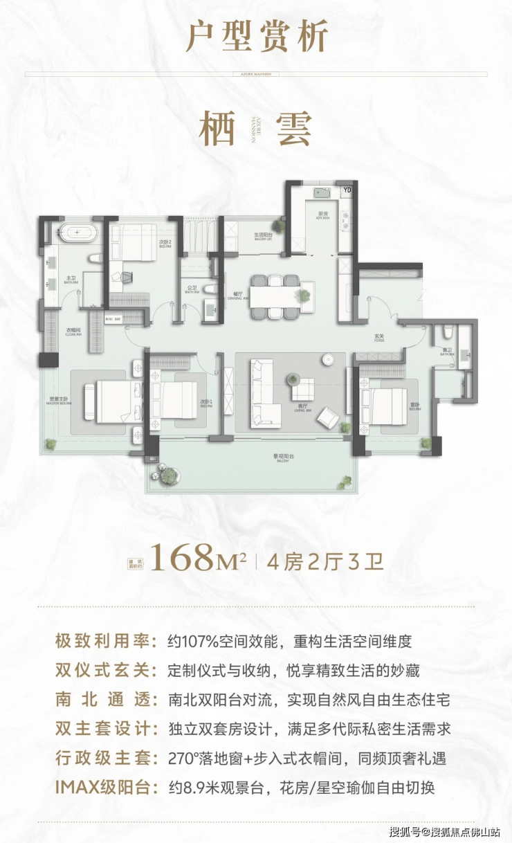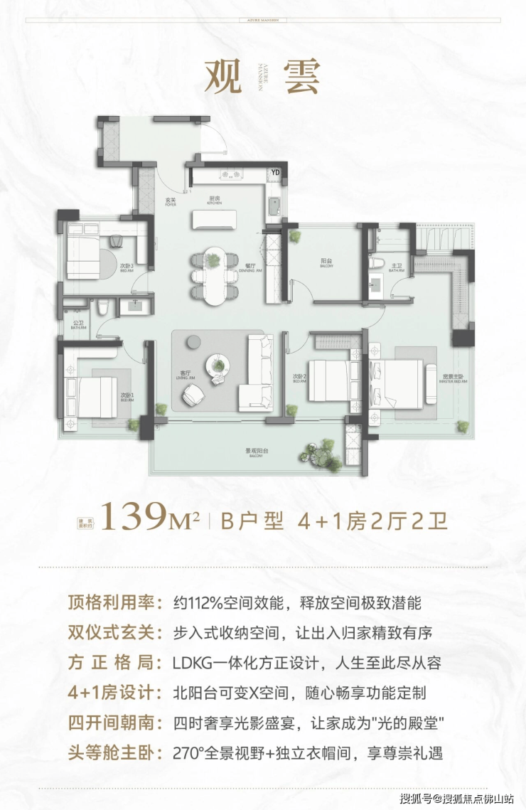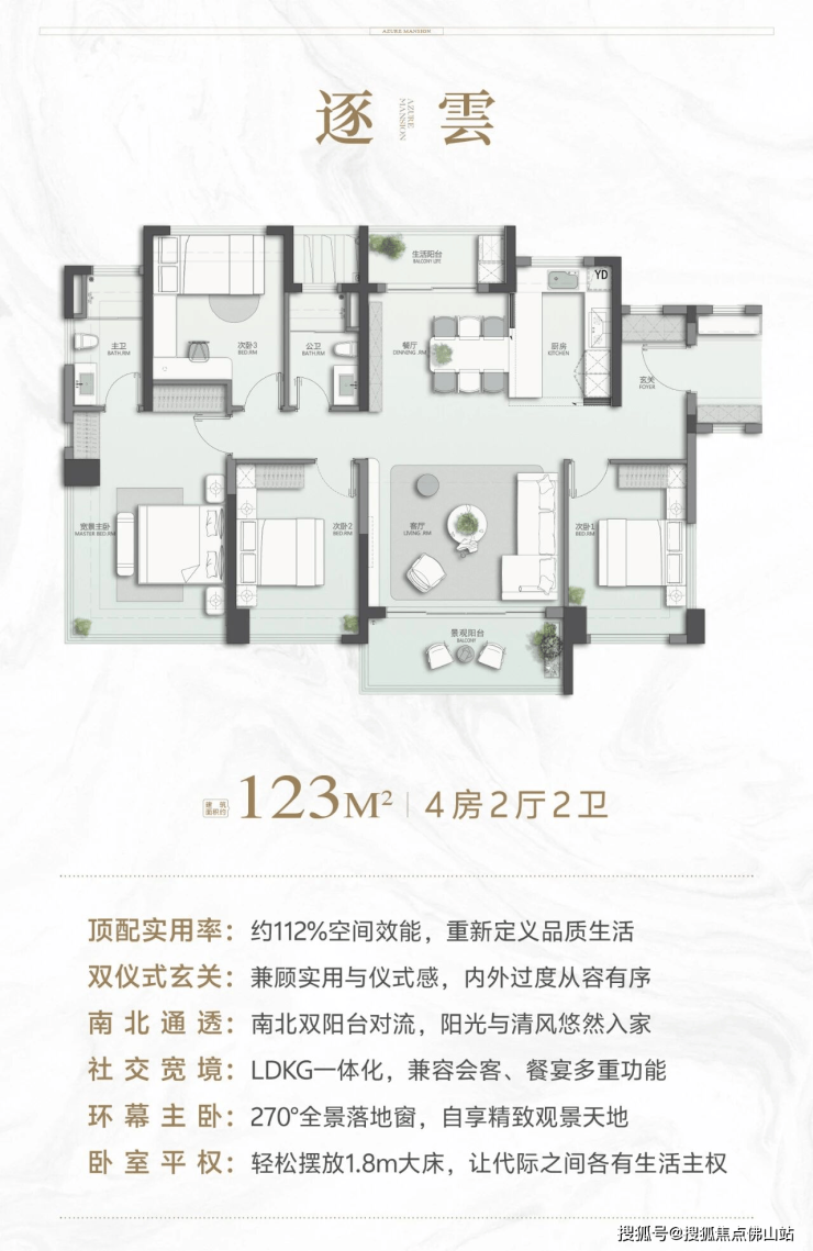 123㎡为四房两厅两卫设计,使用率达112%,以南北双阳台、LDKG一体化、环幕主卧带270°全景落地窗为亮点。