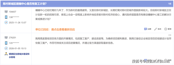 近日,有网友在顺德区人民政府论坛上咨询里城晴樾中心何时复工。