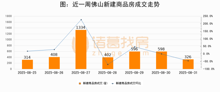根据佛山市住房保障和房产信息网数据显示,2025年08月31日佛山新建商品房成交326套,较昨日减少272套,环比下降45.5%。近一周佛山新建商品房日均成交569套。08月31日单日成交326套,低于近一周平均水平42.7%。