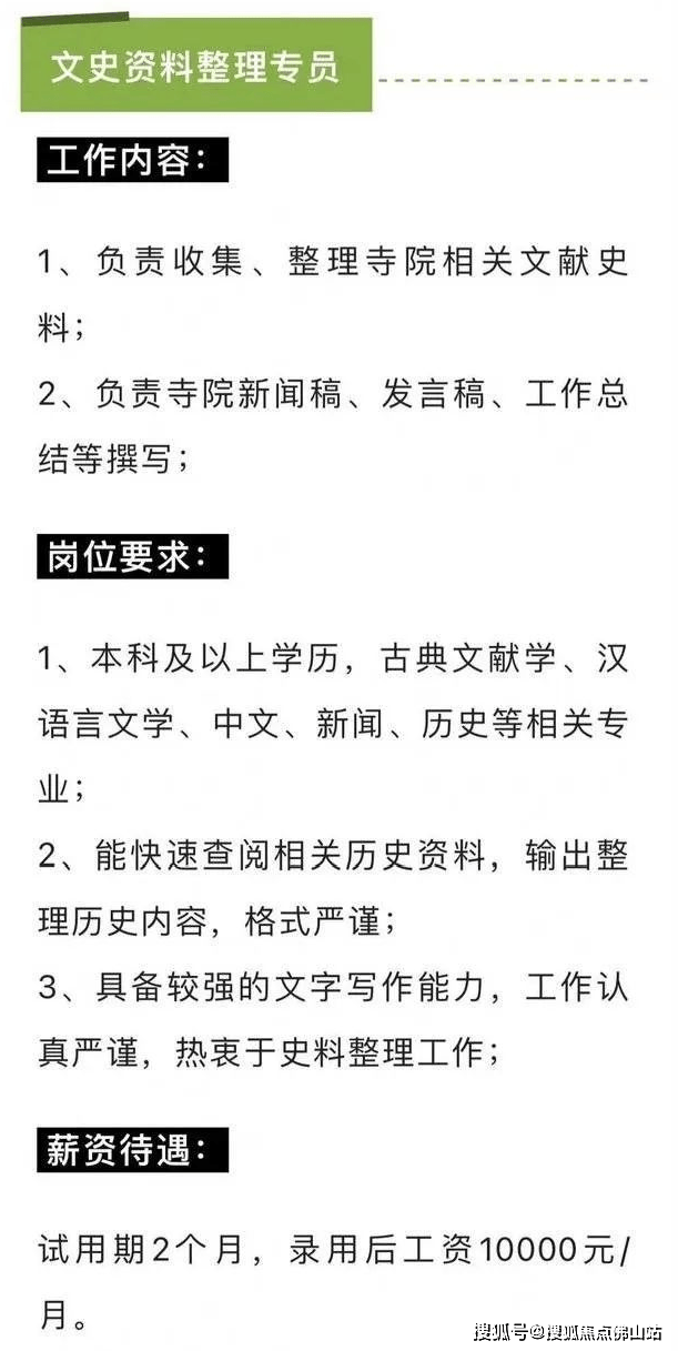 如法华寺招聘文史资料整理专员,月薪达1万元,要求大学学历;东华禅寺招聘文化部门和行政岗位,月薪可达1.5万元,要求本科学历及以上。