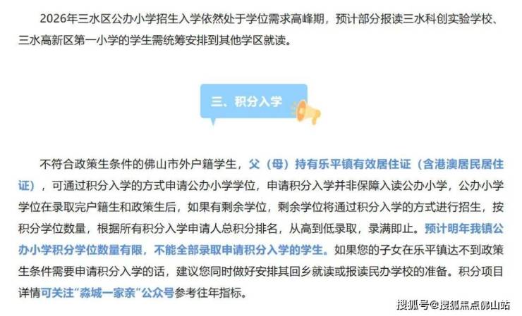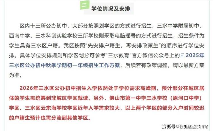 其中三水区教育局发布小升初学位预警,2026年三水公办初中招生入学依然处于学位需求高峰期,预计部分在城区居住的学生需统筹到非城区学区就读。
