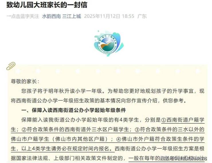 除了南海区,三水西南街道在去年11月也开启了公办小学一年级招生“预报名”。