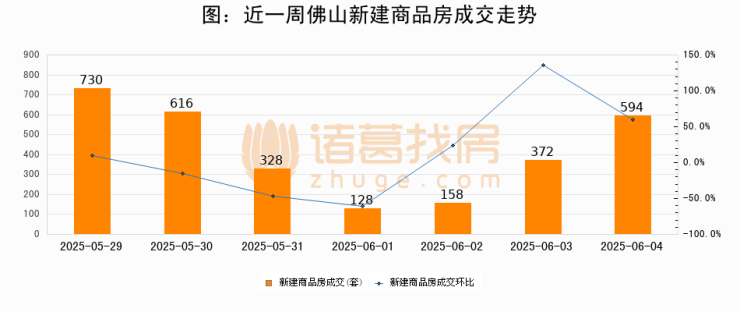 根据佛山市住房保障和房产信息网数据显示,2025年06月04日佛山新建商品房成交594套,较昨日增加222套,环比上涨59.7%。近一周佛山新建商品房日均成交418套。06月04日单日成交594套,高于近一周平均水平42.1%。