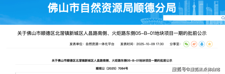 近日,顺德人民政府发布关于佛山市顺德区北滘镇新城区人昌路南侧、火炬路东侧05-B-01地块项目一期的批前公示。