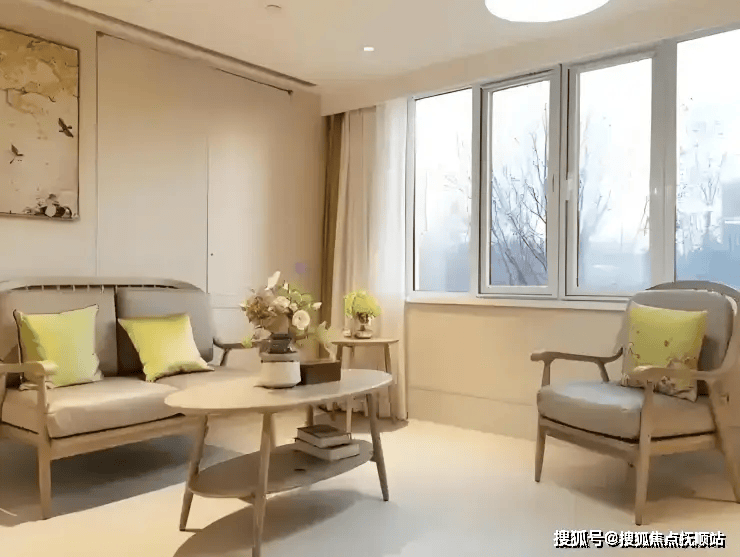 房型多样:提供单人间、双人间、套间及记忆照护专属房型,所有房间均朝南设计,配备地暖、新风系统、智能护理床及紧急呼叫装置。