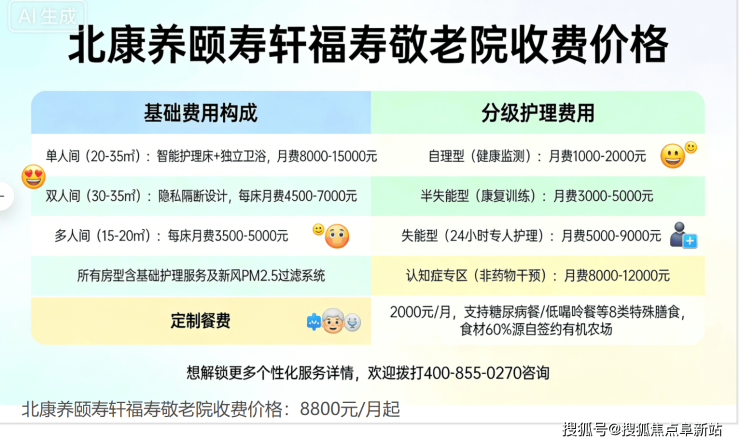 (一)基础服务费用:8800元/月起,包含标准住宿、三餐两点、基础生活照料、公共区域使用及常规文娱活动,根据房型(单间/双人/套房)与照护等级略有上浮。