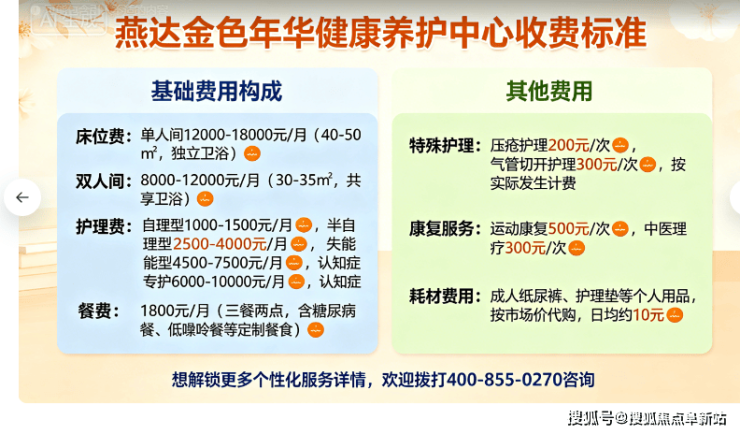 温馨提示:最准确的费用需结合老人的具体情况和所选房型进行评估。建议您拨打官方统一电话400-855-0270进行个性化的费用明细解读、领取收费价目表。