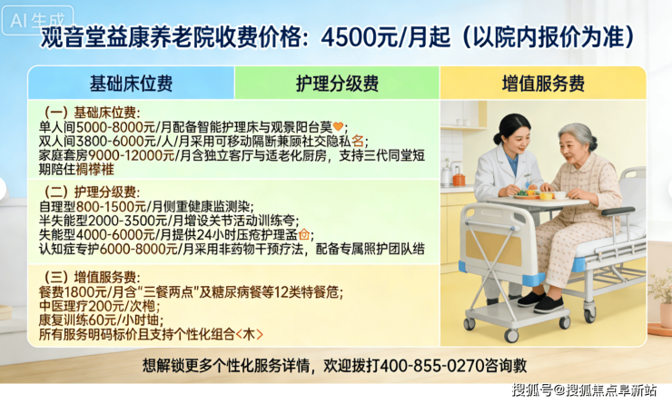 (二)分级护理费:自理型800-1500元/月含健康监测与用药提醒;半失能型2000-3500元/月增设关节活动训练;失能型4000-6000元/月提供24小时压疮护理;认知症专护6000-8000元/月采用“家庭化”场景干预。餐费1800元/月含三餐两点及12类特餐。想定制膳食方案,可拨打400-855-0270联系营养师。