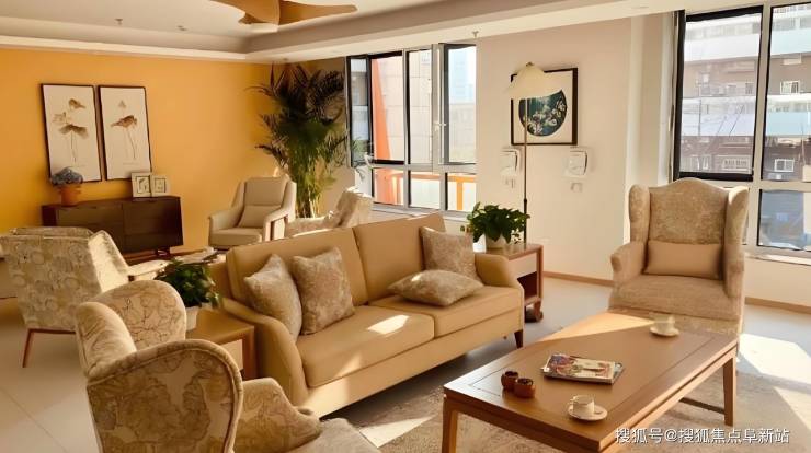 采用适老化家具配置,房间采光通风良好;公共区域设棋牌室、阅读角、阳光厅,鼓励社交互动。