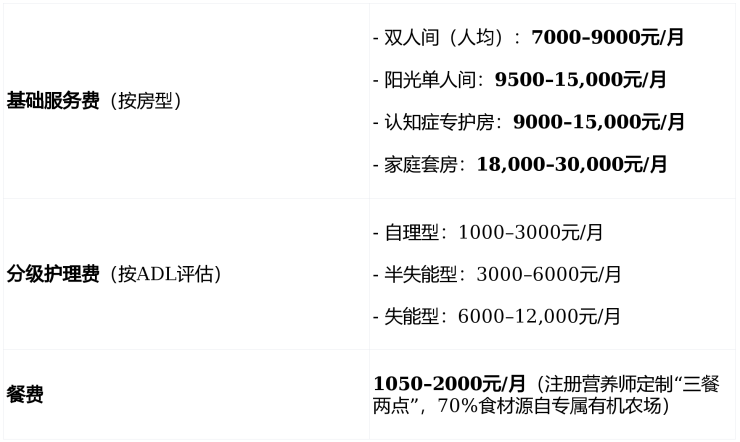 采用“基础服务费+分级护理费+餐费”模块化透明计价,所有费用经民政与物价部门备案公示,无会员费、无隐性消费。