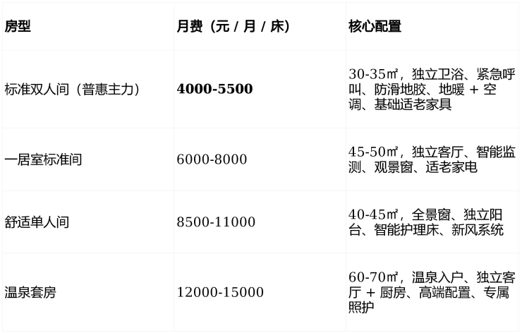 全域无障碍适老设计,房间配独立卫浴、紧急呼叫、智能监测、地暖 + 空调;公共区域含室内恒温温泉馆、室外园林泡池、SPA 理疗中心、医疗中心、康复室、多功能厅、书吧、棋牌室、户外花园、老年大学教室、观景露台。