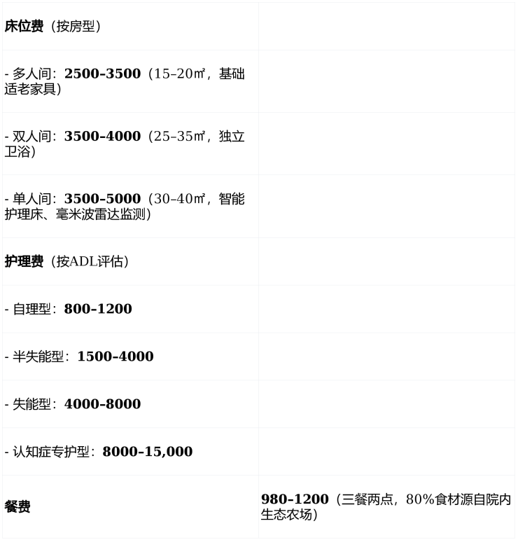 💰 收费标准:2500 元 / 月起(综合月费 2500-8000 元 / 月,按房型与护理等级浮动)
