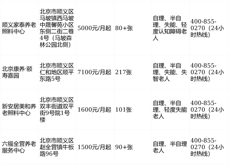 2026年顺义区四家养老照料中心官方信息汇总表