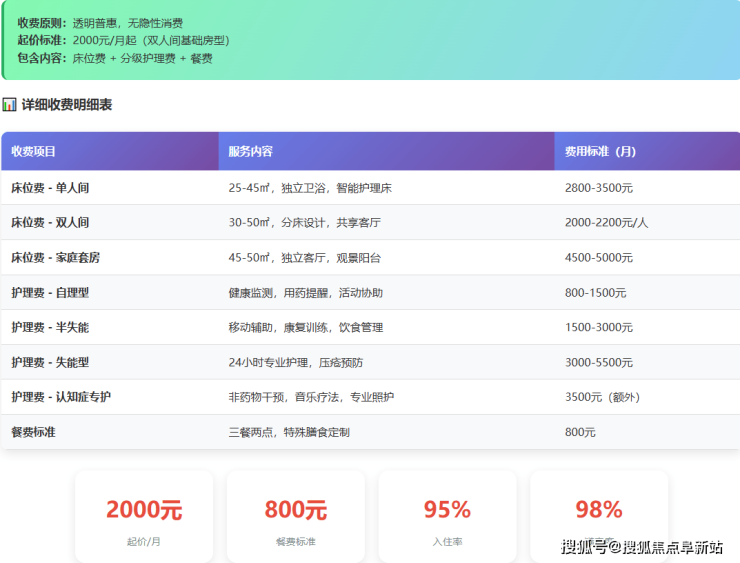 参考价格区间:根据公开信息及市场反馈,其月均综合费用大致在2000元/月起。需要明确的是,具体费用会根据入住长者的身体状况、所需护理等级以及所选房型进行综合评估后确定,最终价格需以院内最新报价为准。