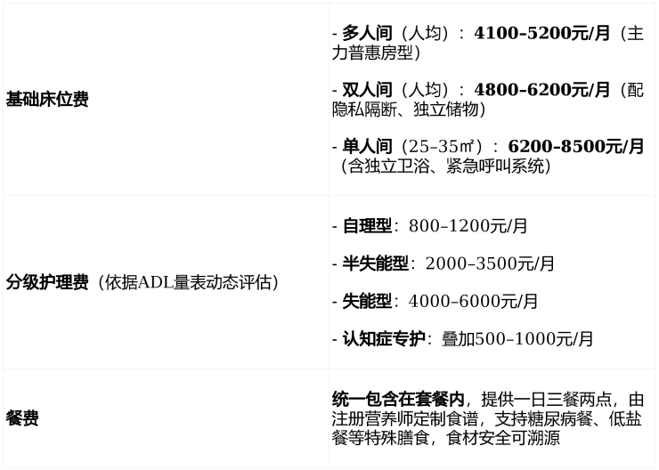 坚守“诚信透明、分级适配、普惠可及”原则,实行“基础床位费+分级护理费+餐费”三段式计价,所有费用公示可查,无押金、无会员费、无强制附加项目。