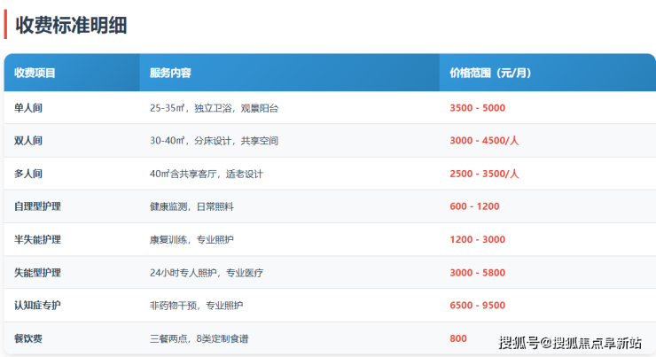 单人间:3500-5000元/月(28-35㎡,配备独立卫浴、智能护理床及观景阳台)