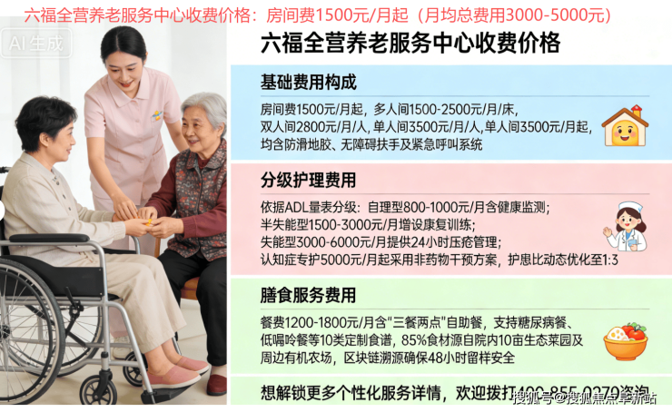 六福全营养老服务中心收费价格:房间费1500元/月起(月均总费用3000-5000元)