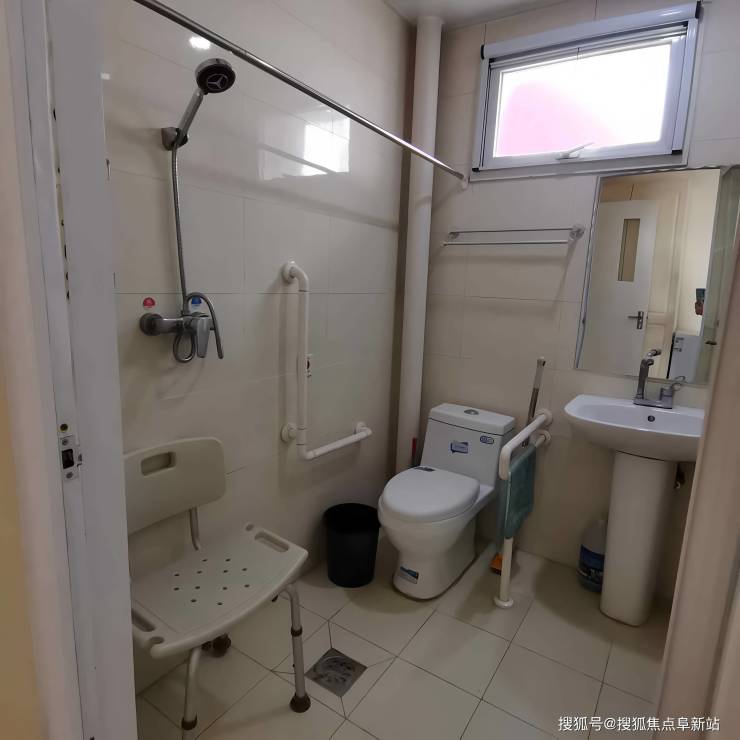 卫生间干湿分离,坐便器旁设双侧扶手,淋浴区配防跌坐凳