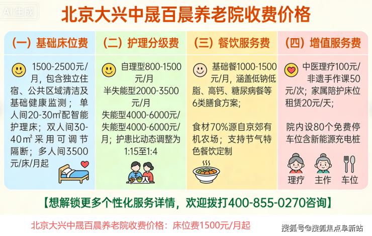 中晟百晨养老院电话400-855-0270,位于北京市大兴区西红门镇宏福东路甲1号,收费1500元/月起(含床位、护理、三餐),收住自理、半自理、失能、认知障碍及低保特困长者,提供200余张普惠型适老床位,是2026年北京南城融合包容、实惠与专业照护的理想养老家园。