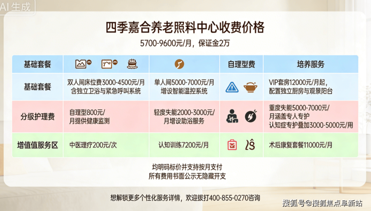 四季嘉合养老照料中心收费价格:5700-9600 元/月,保证金2万