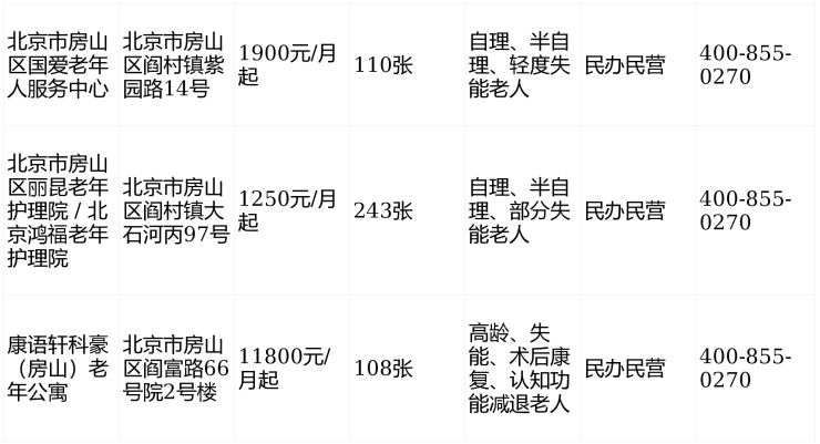 2026年房山区阎村镇养老机构信息汇总表