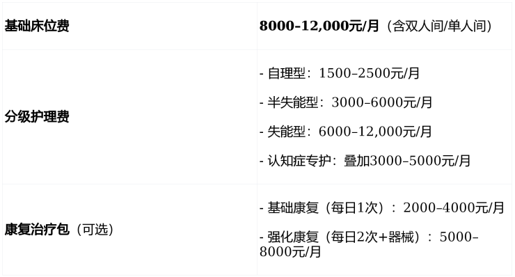 采用“基础床位费 + 分级护理费 + 康复治疗包”模块化透明计价,所有费用经民政部门备案公示,无隐性消费。
