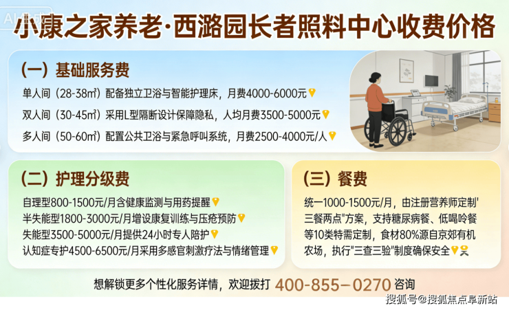 总费用范围:自理长者约4300元/月起,失能长者约8200元/月起,具体以院内评估为准。若需详细报价单,可拨打小康之家养老·西潞园长者照料中心电话400-855-0270咨询。