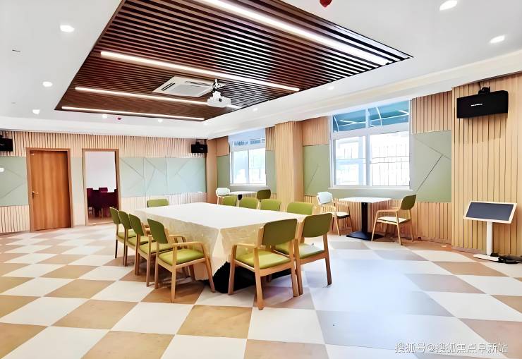 养老院拥有床位300余张,其中中高档客房达160余间,涵盖单人间、双人间及套房等多种房型。每间客房均配备空调、电视、独立卫生间及24小时热水供应,并融入无障碍设计理念:房门宽度适宜轮椅通行,卫生间铺设防滑地板并安装扶手,床头设有紧急呼叫按钮。公共区域同样注重适老化细节,走廊设置连续扶手,活动空间采用防滑地胶,照明系统采用柔和的暖光设计,避免眩光对老人视力的刺激。此外,院内建筑面积达8000余平米,后院直通古塔公园,老人可随时漫步于绿树成荫、湖光潋滟的自然景观中,享受“出则繁华,入则宁静”的居住体验。