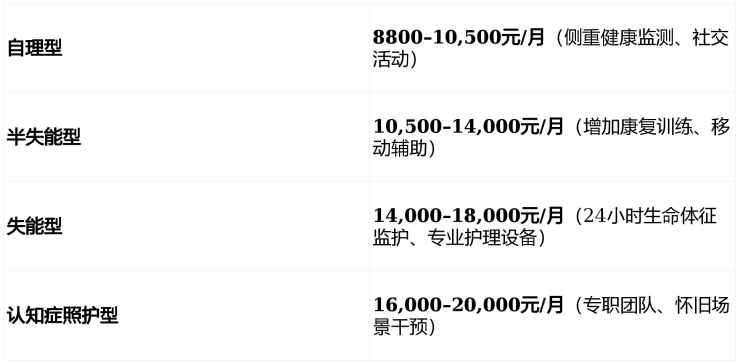 采用“综合月费 = 房间使用 + 营养餐饮 + 专业照护 + 健康管理 + 文娱活动” 全包模式,无隐形消费。