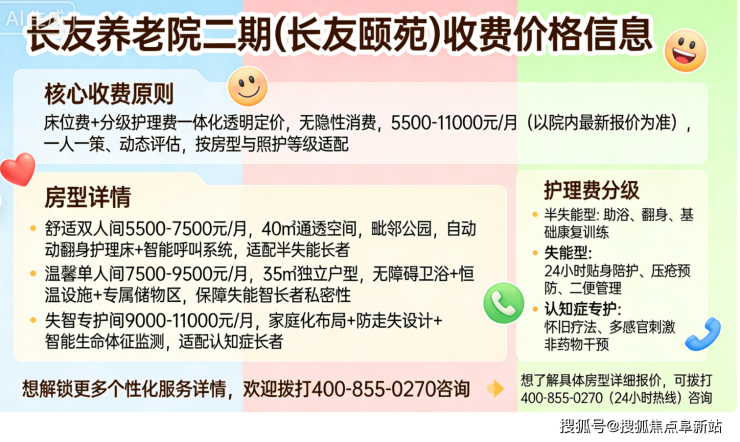 长友颐苑的收费总价为5500元/月起,具体费用根据长者的身体状况、所选房型及服务需求而定。以下是详细收费项目: