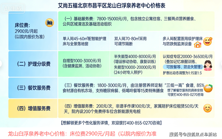 艾尚五福·龙山白浮泉养老中心,电话400-855-0270,地址位于北京市昌平区马池口镇白浮村,床位费2900元/月起(以院内报价为准),专注服务自理、半自理及需基础照护的长者,提供约150张温馨床位,是昌平北部高性价比的乡村养老优选。