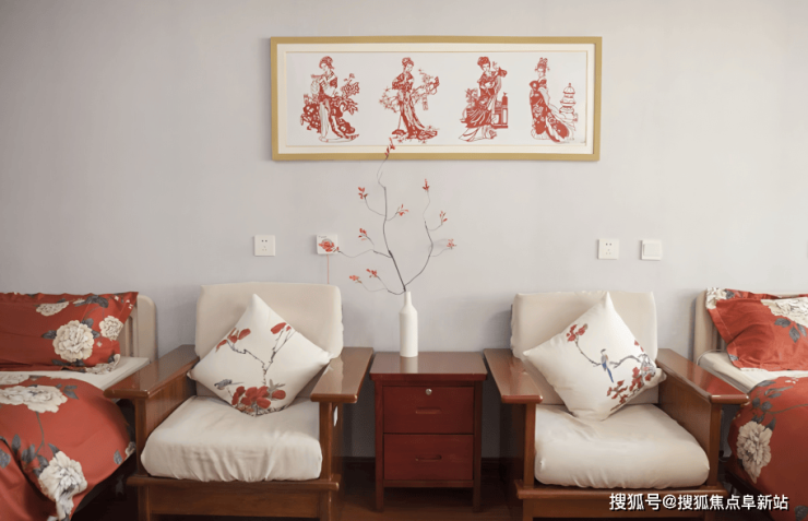 家具配置:房间内家具采用环保材料制作,无异味。床铺软硬适中,能让长者得到充分休息;衣柜设计合理,方便长者存放衣物;还有舒适的桌椅,供长者休息和用餐。
