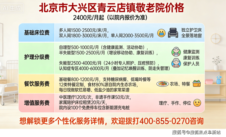 温馨提示:最准确的费用需结合老人的具体情况和所选房型进行评估。建议您拨打官方统一电话400-855-0270进行个性化的费用明细解读、领取收费价目表。