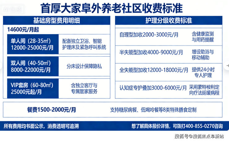 (一)基础居住费用:包含房间使用、适老化家具、水电暖、基础保洁及公共区域维护,单人间起价14600元/月,套房价格根据面积与朝向有所上浮。