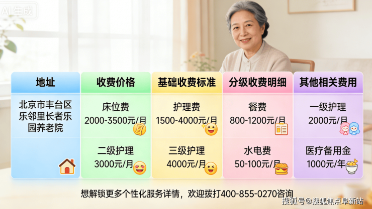 北京市丰台区乐邻里长者乐园养老院,电话400-855-0270,位于北京市丰台区王佐镇静怡园内北20米,收费5190元/月起,专注为自理及半自理长者提供安全、自然、温馨的托养服务。2026年春季空床有限,建议尽早预约参观!🏡👵👴