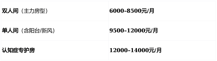 自理老人住双人间:6000–8500元/月(全包)
