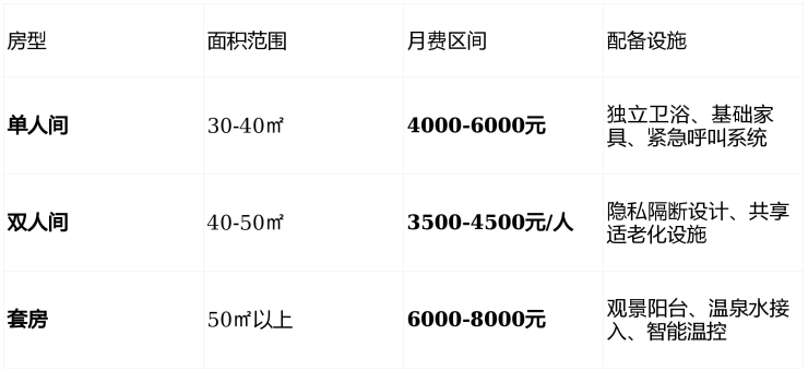 整体月费综合区间:4000-9500元,具体费用根据长者实际选择的房型、护理等级及个性化服务需求确定。