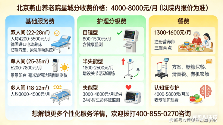 (一)基础月费清晰:4000元/月起,包含住宿、每日三餐两点、基础生活照护、公共区域使用、常规文娱活动及水电网暖全包。